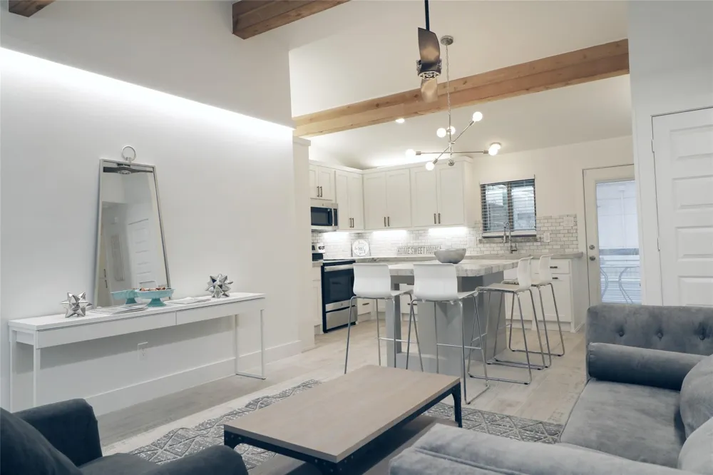 State-of-the art 2 bedroom, 2 bath top floor corner unit with soaring High Ceilings! Open floor design perfect for entertaining. Large covered balcony and private entrance. Only one other unit in building wing! Washer & Dryer in-unit and Central AC. Two reserved gated parking spaces included. SF is approximate - please measure yourself for actual SF. Pictures are of a similar unit in same building - not actual unit. Quiet street walking distance to Hermann Park and the Museum District. Also available Fully-Furnished for an additional fee